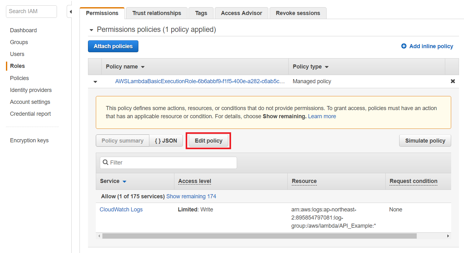 이제 다음과 같이 IAM 규칙(Role)이 설정이 되어서 이제 CloudWatch의 로그(Log)가 쌓이게 됩니다.