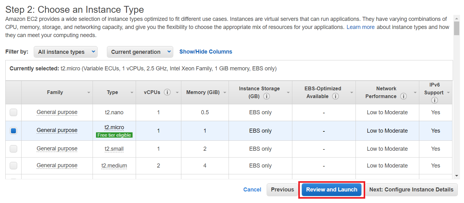 3. 무료 유형인 [t2.micro] 인스턴스 유형을 선택한 뒤 [검토 및 시작] 버튼을 누릅니다. 이후에 인스턴스를 시작할 수 있도록 하면 됩니다.