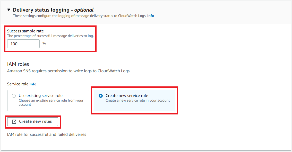 저는 100%으로 설정했으므로 모든 문자 메시지(SMS) 전송에 대해서 로그에 기록합니다. 그리고 [Create new service role] 탭을 클릭하고 [Create new roles] 버튼을 눌러 새롭게 규칙을 설정할 수 있습니다.