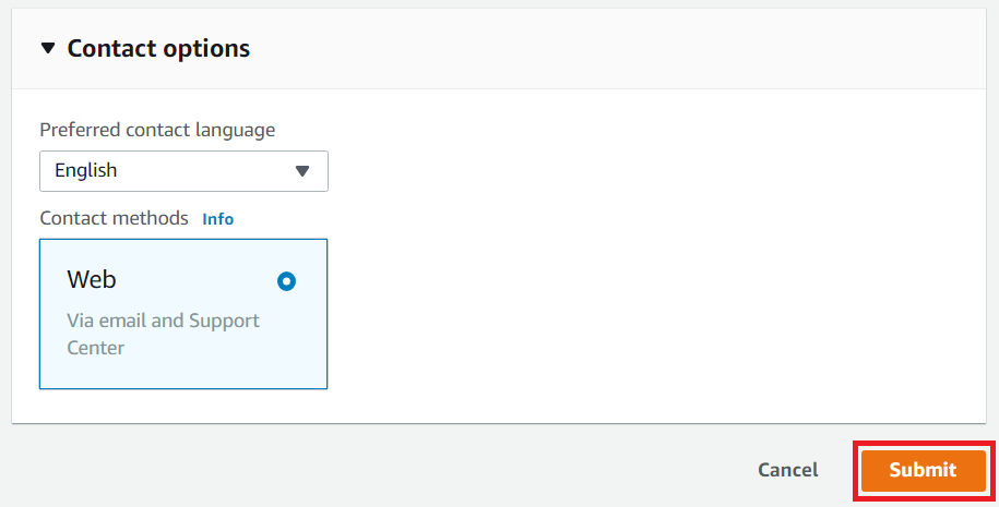 이후에 [Contact Options] 탭에서 회신을 받을 언어 등을 설정해서 [Submit]을 진행하시면 됩니다.