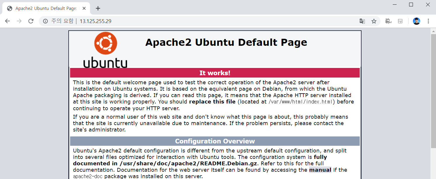 12. 공인 IP로 접속하여 웹 서버가 정상적으로 구동하는지 확인합니다.