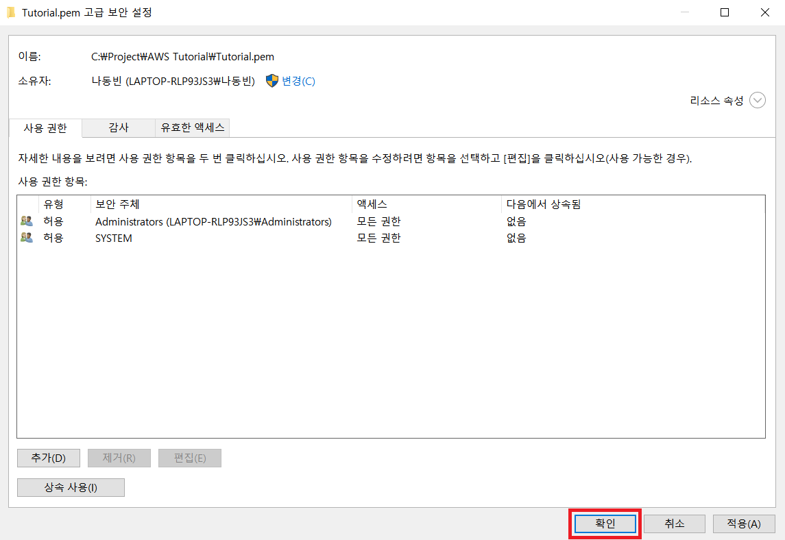 2) 윈도우: 키 페어를 우클릭 한 뒤에 [속성] - [보안] - [고급] - [상속 사용 안 함] - [명시적 사용] - [관리자 제외하고 모든 그룹 삭제]를 진행합니다. 이후에 관리자 권한으로 CMD를 실행합니다.
