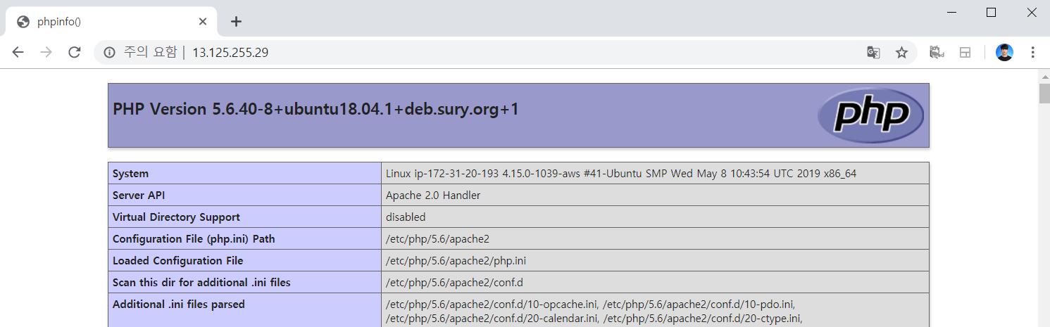 5. 공인 IP의 /index.php로 접속하여 PHP 연동이 제대로 됐는지 확인합니다.