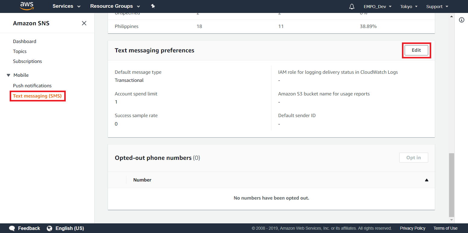 AWS SNS의 문자 메시지(SMS) 전송 기능을 이용하다 보면, 때때로 다양한 문제에 직면할 수 있습니다. 그러한 문제에 적절히 대응하기 위해서는 AWS SMS 기능에 대한 로그(Log) 관리가 필요합니다. 로그 관리는 Text messaging (SMS) 탭에서 [Edit] 버튼을 눌러서 수행할 수 있습니다.