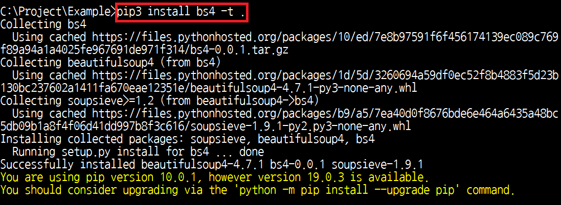 당연히 라이브러리가 없으니 오류가 발생합니다. 따라서 로컬에서 pip3 명령을 이용해 bs4를 설치합니다. -t 옵션을 이용하면 특정한 경로에 bs4 라이브러리를 다운로드 할 수 있습니다.