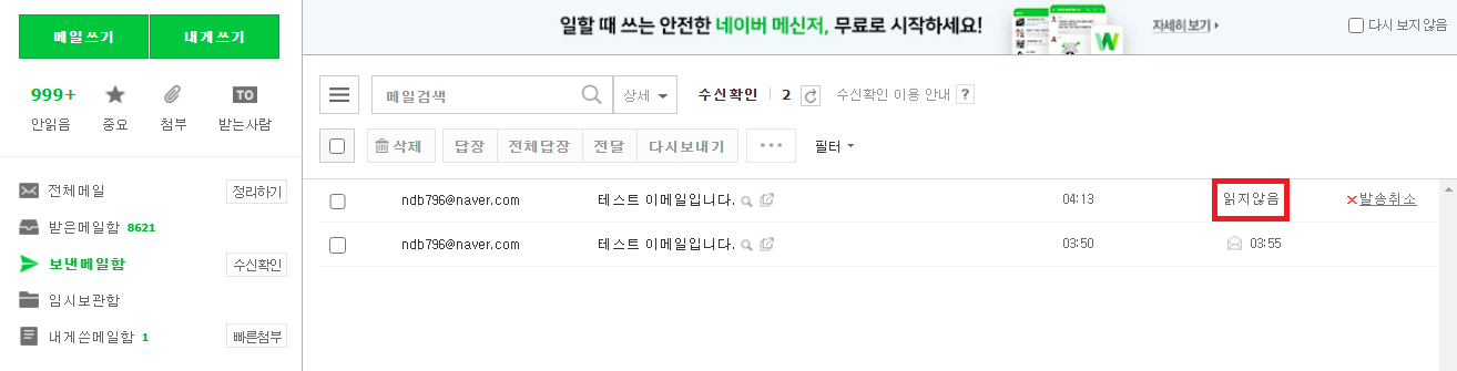 이러한 방법을 이용해서 메일을 읽게 되면 메일의 내용은 모두 읽을 수 있지만, 상대방에게 수신확인 알림이 가지 않게 됩니다. 실제로 메일을 보낸 사람 입장에서 메일을 확인해 보면, 다음과 같이 [읽지않음] 이라고 표시되는 것을 확인할 수 있습니다.
