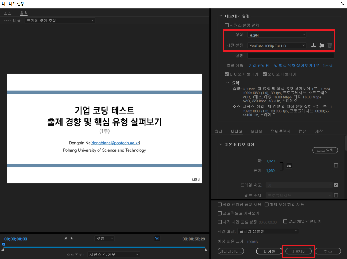 아래와 같은 화면이 나오는데 바로 [내보내기] 버튼을 눌러서 동영상을 내보내시면 됩니다. 일반적으로 .mp4 확장자로 동영상의 용량이 적절히 잘 압축되도록 합니다. 저는 주로 YouTube 업로드 용으로 1080p 화질로 영상을 내보내는 경우가 많습니다.