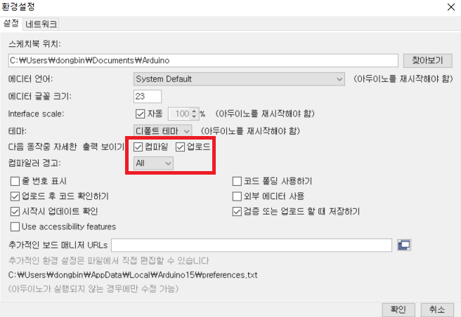 아두이노에서 이처럼 컴파일 오류가 발생하는 경우에는 자세히 확인하기 위해서 환경설정에서 컴파일, 업로드와 관련한 자세한 메시지가 출력되도록 설정을 바꿀 필요가 있다.