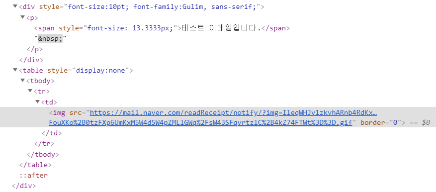 그 이유는 네이버 메일의 수신 확인 기능의 원리를 이해하면 간단히 이해할 수 있습니다. 네이버 메일은 기본적으로 메일 안에 눈에 띄지 않는 작은 크기의 수신 확인용 이미지를 같이 보냅니다. 받는 사람 쪽에서 메일 내용을 확인해 보면, 다음과 같이 눈에 보이지 않는 작은 이미지가 삽입된 것을 확인할 수 있습니다. 웹 브라우저는 이미지를 화면에 출력하기 위해 이러한 이미지 URL을 자동으로 호출하게 되는데 네이버 측에서는 이를 이용해 수신 확인을 감지합니다.