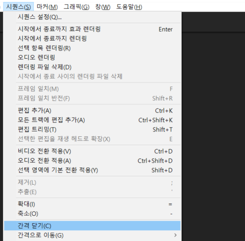 다음과 같이 [시퀀스] - [간격 닫기(C)]를 눌러주시면 됩니다.