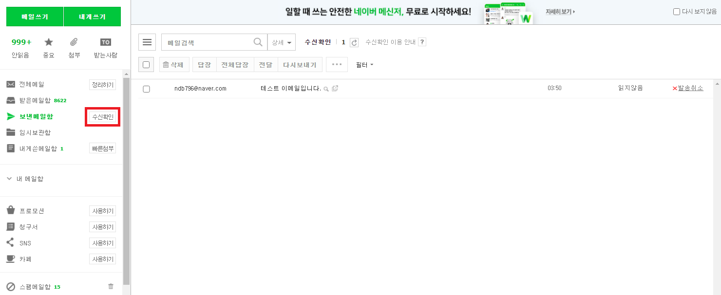 네이버 메일 서비스는 메일을 보낸 뒤에 [수신확인] 탭으로 이동하면, 내가 보냈던 각 메일에 대하여 상대방이 언제 읽었는지에 대한 정보를 확인할 수 있습니다.
