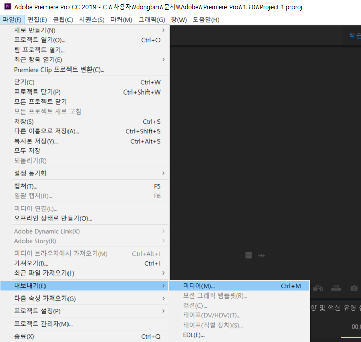최종적으로 편집된 동영상을 내보낼 때에는 다음과 같이 [파일] - [내보내기] - [미디어]에 들어가서 어떠한 형식으로 영상을 내보낼 지 설정할 수 있습니다.