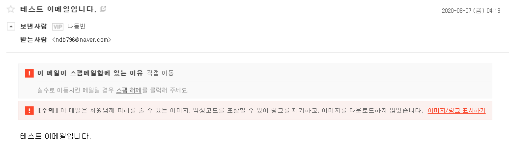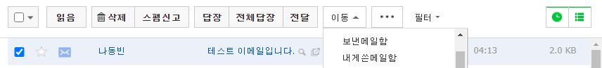 바로 메일을 읽을 때 [이동]을 눌러서 [스팸메일함]으로 먼저 보낸 뒤에 읽는 것입니다. 특정 이메일을 스팸메일함으로 보내게 되면 다음과 같이 "이미지를 다운로드하지 않았습니다."라는 메시지가 출력되는 것을 확인할 수 있습니다.