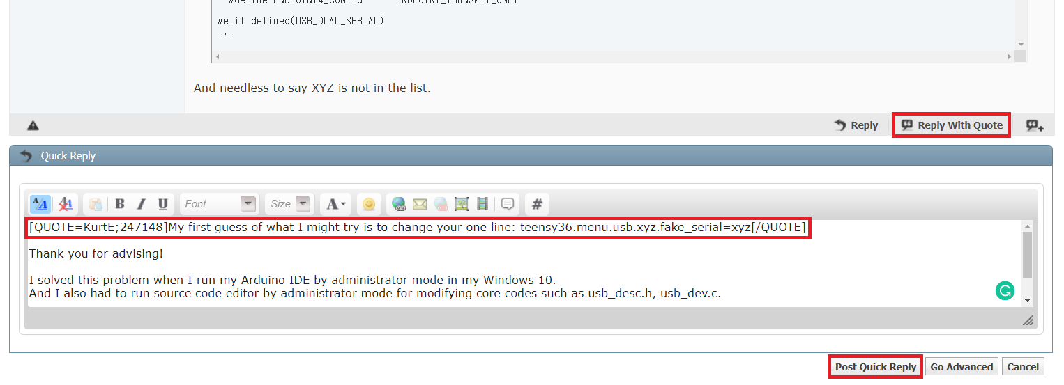 이후에 댓글에 대하여 다시 댓글을 다는 방법은 다음과 같습니다. [Reply With Quote] 버튼을 눌러서 다른 사람의 글에서 인용할 부분을 설정합니다. 그리고 글의 내용을 작성하면 됩니다. [Post Quick Reply] 버튼을 눌러서 댓글을 등록할 수 있습니다.