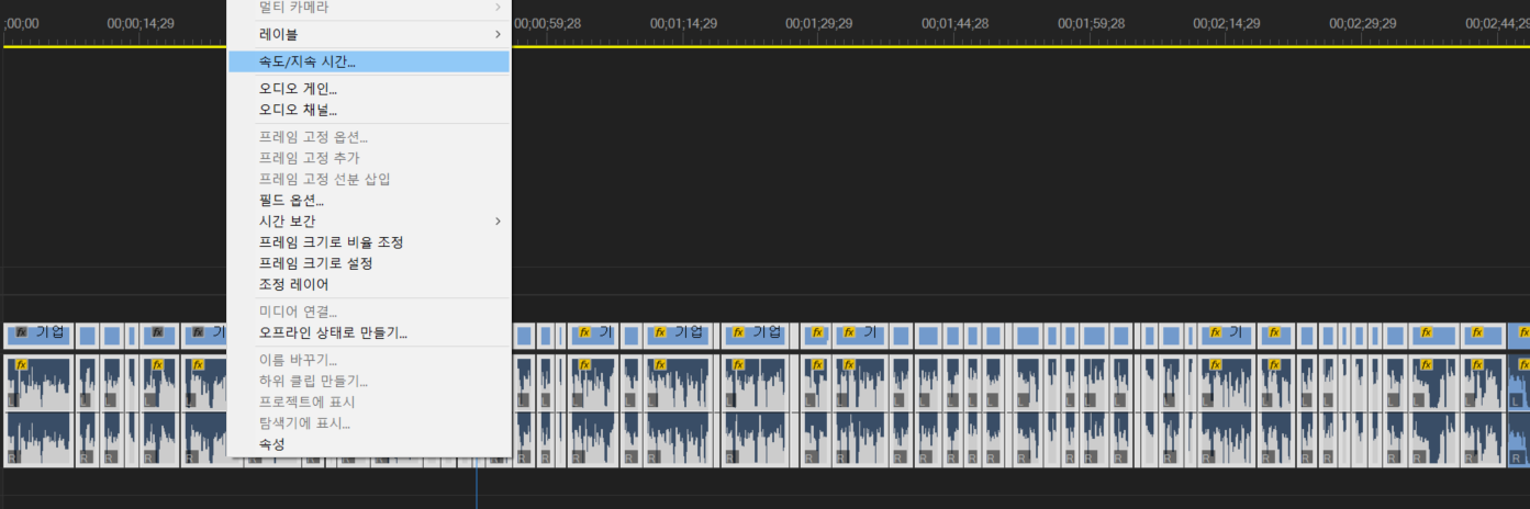 또한 교육용 동영상을 편집하거나 할 때는 빠르게 편집하기 위해서 속도(빠르기)를 잠시 2배 정도로 늘려서 편집한 뒤에, 나중에 다시 속도를 원상복귀 하는 방법이 많이 사용됩니다. 속도를 조절할 때는 우클릭 이후에 [속도/지속 시간]을 누르시면 됩니다.