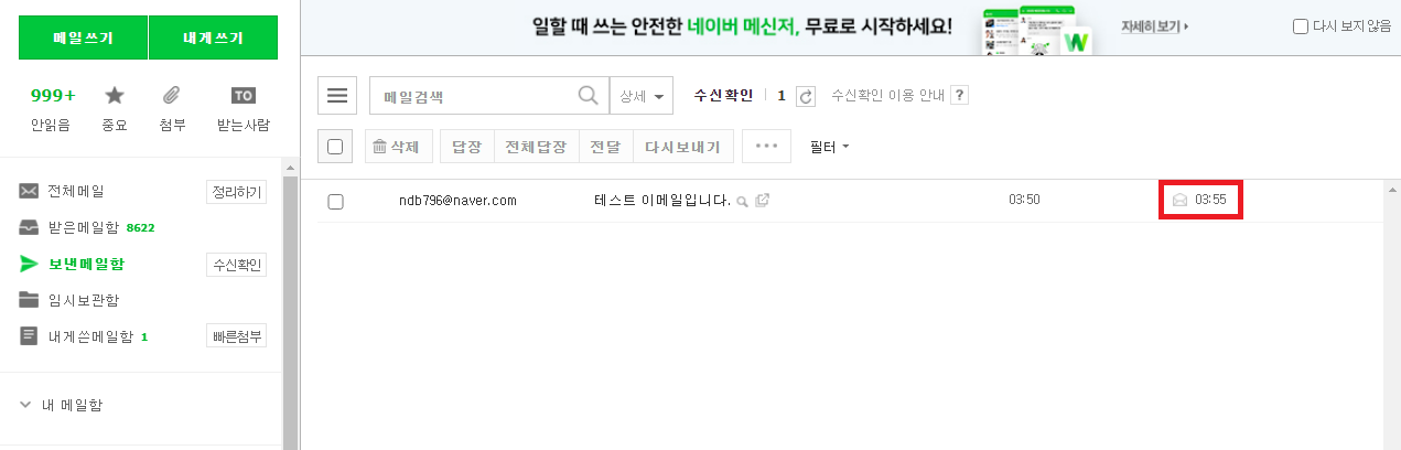 내가 보낸 메일을 상대방이 읽고 나면, 다음과 같이 읽은 시간이 나오게 됩니다.