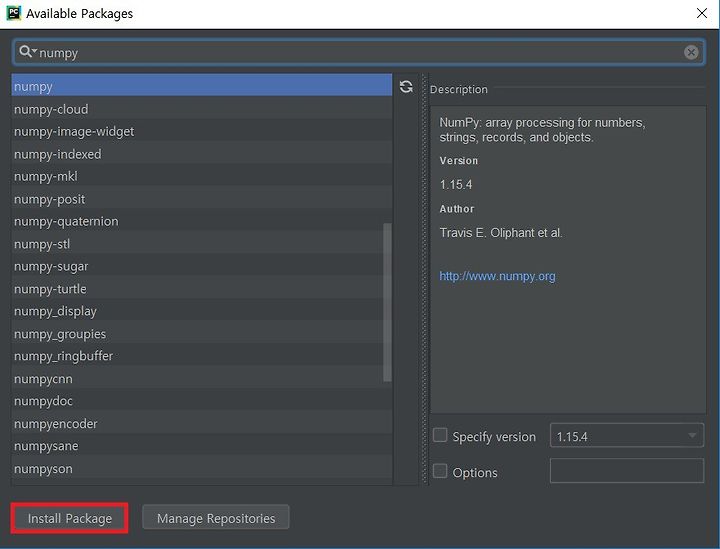 Numpy를 검색해서 설치를 진행합니다.