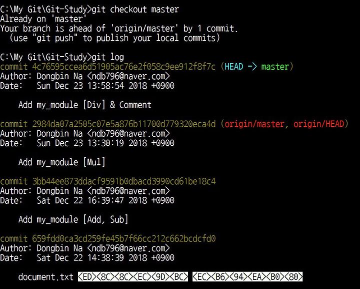 이어서 로그(Log)까지 확인해보면 현재 마스터 브랜치를 가리키고 있으므로 마스터 브랜치에 대한 정보만 출력됩니다.