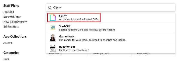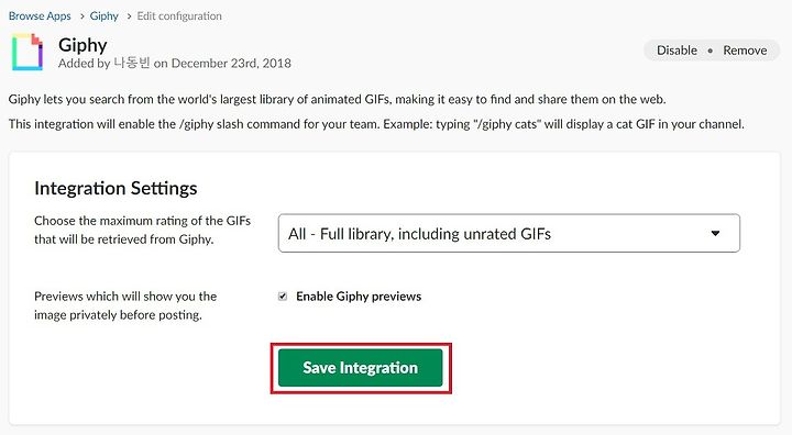 이후에 웹 페이지 환경에서 슬랙 앱을 검색하여 설치를 진행할 수 있습니다. 저는 가장 먼저 지피(Giphy)를 사용해보도록 하겠습니다. 지피는 자동으로 이미지를 검색하여 슬랙 채널에 이미지를 출력해주는 역할을 수행합니다.