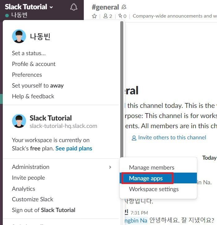 슬랙(Slack)에서는 슬랙 앱(Slack App) 기능을 이용하여 프로젝트를 더욱 효과적으로 관리할 수 있습니다. 이번 시간에는 다른 사람들이 만들어 놓은 슬랙 앱을 간단히 사용해 보며 슬랙 앱을 어떻게 이용할 수 있는지에 대해서 알아보도록 하겠습니다. 기본적으로 슬랙 앱을 관리하고자 한다면 [Manage apps] 탭으로 이동하여 슬랙 앱을 관리할 수 있습니다.