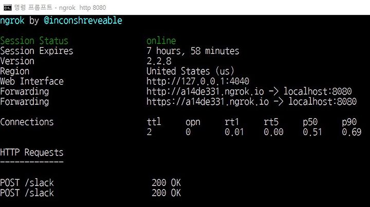 Ngrok의 로그를 확인해 보았을 때에도 성공적으로 슬랙 API와 통신한 것을 확인할 수 있습니다.