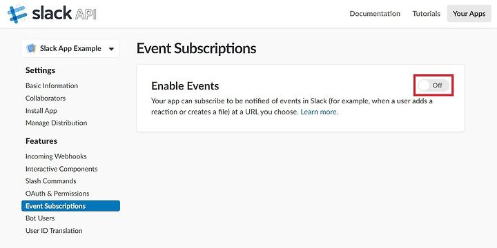 슬랙(Slack) 챗봇(Chat Bot)은 사용자가 슬랙 봇에게 말을 걸었을 때 그에 대한 적절한 응답을 수행하는 봇을 의미합니다. 그래서 슬랙 챗봇을 구현하고자 한다면 사용자가 챗봇을 부르는 과정을 이벤트(Event)로 받아들여 슬랙 챗봇이 동작하도록 해야 합니다. 따라서 이전 시간에 이어서 슬랙 챗봇을 구현해보도록 하겠습니다. 가장 먼저 이벤트 구독(Event Subscriptions) 탭에 들어갑니다.