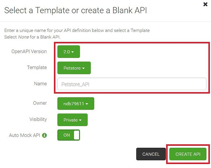 이후에 API를 생성할 때는 설정을 진행할 수 있습니다. Open API 버전은 현재 2.0이 가장 많이 사용되며, 템플릿(Template)을 정해줄 수 있습니다. 템플릿은 API 명세서를 더 쉽게 작성할 수 있도록 도와주는 것으로, 기본적인 API 명세서 형태를 미리 갖춘 문서를 의미합니다.