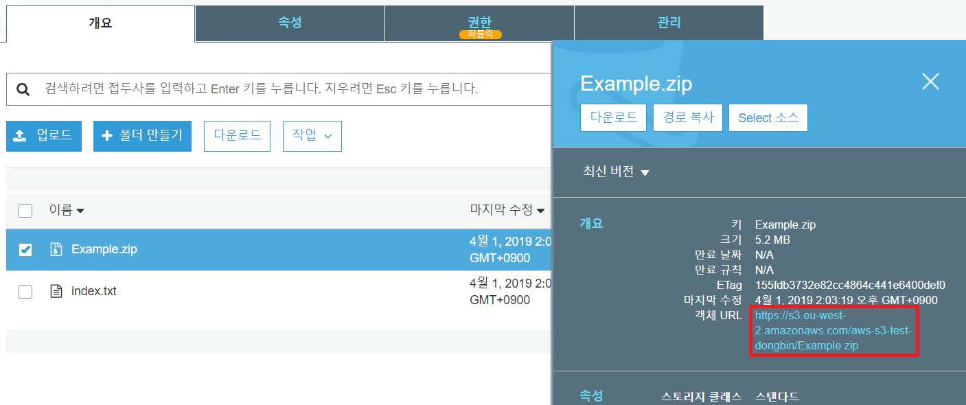 이제 사용자 입장에서 해당 파일을 다운로드 받는다고 가정하겠습니다. 특정한 파일을 누르면 퍼블릭(Public)에서 접근 가능한 URL 경로를 확인할 수 있습니다.