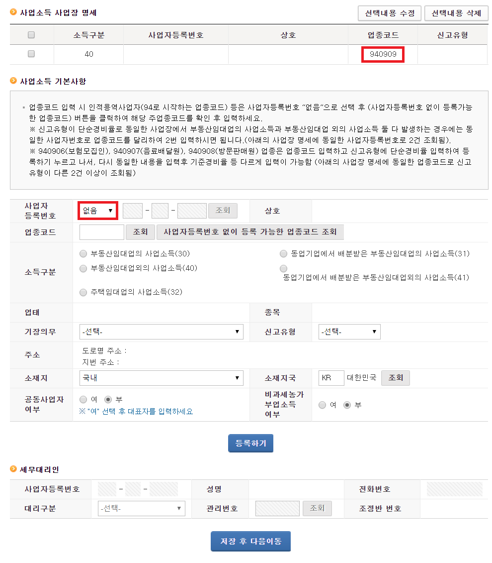 저는 사업소득이 있기 때문에 다음과 같이 추가적으로 사업장을 명세하라는 내용이 나옵니다. 저는 강의 활동을 했기 때문에, 업종코드가 940909로 나오고, 이 경우 사업자 등록번호 [없음]을 선택합니다. (앞서 말씀드렸듯이, 방송을 하시는 분이라면 투네이션 수익도 '사업소득'으로 잡히게 됩니다. 물론 저는 해당사항 없습니다.)