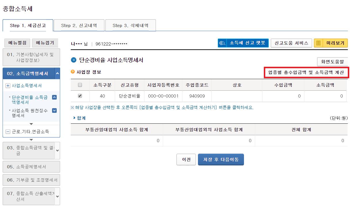 이제 사업소득 금액 명세가 완료되었습니다. 넘어가겠습니다.