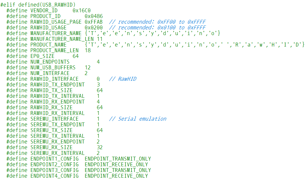 여기에서 핵심이 되는 내용은 Vendor ID, Product ID인데요. 이 값을 통해서 Host OS가 USB Device를 정확히 찾아 접근할 수 있습니다. 또한 Product Name은 "Teensyduino RawHID"인데요, 이게 나중에 Host OS에서 출력될 USB Device의 이름이 됩니다.
