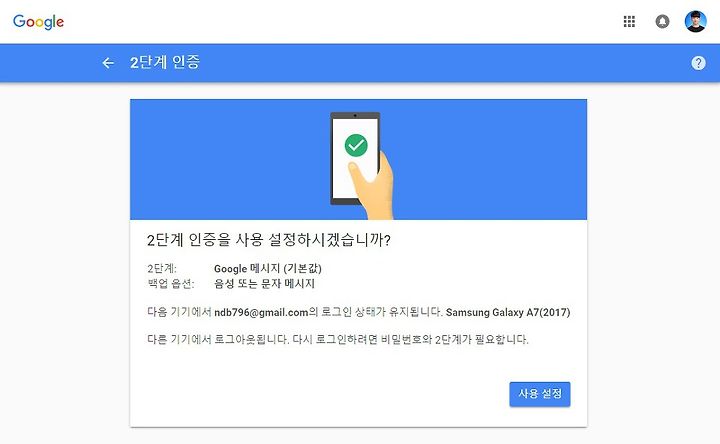 휴대폰 인증이 완료되면 위와 같이 '사용 설정'을 해줄 수 있습니다.