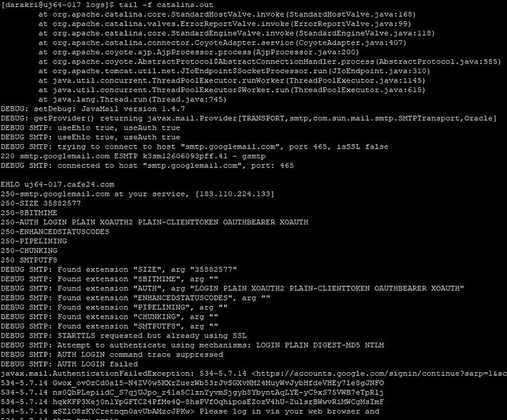 위와 같이 성공적으로 서비스가 생성되었구요. 이제 SMTP 소스코드에서 인증하는 부분의 비밀번호를 아까 받은 비밀번호로 넣으시면 됩니다. 아이디는 그대로 구글 계정을 쓰시면 되구요. JSP에서의 예제는 다음과 같습니다.