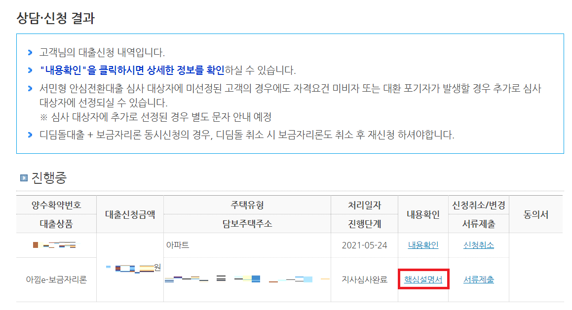 필자의 경우 심사 결과 다음과 같이 "지사심사완료"라고 나왔으며, 승인이 완료되었다. 이제 실제로 대출 실행이 가능한 상태가 된 것이다. 구체적인 내용은 [핵심설명서] 버튼을 눌러 확인 가능하다.