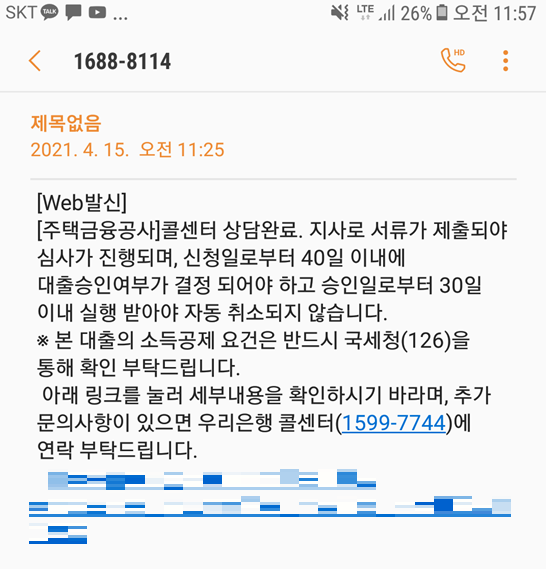 대출 신청이 완료되면, 콜센터에서 상담이 온다. (필자의 경우 대출 신청 이후 2일 뒤에 왔다.) 필자는 우리은행을 선택했기 때문에 우리은행 지점에서 연락이 왔다. 콜센터 상담을 할 때는 본인이 대출 신청할 때 작성했던 내용을 중심으로 확인 절차를 진행한다. 이때 대출 내용을 변경하는 것도 가능했다. 콜센터 상담이 완료되면 다음과 같은 문자 메시지를 받게 된다.