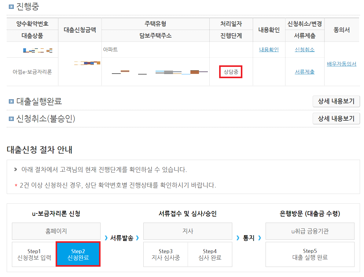 이어서 5월 10일에 한국주택금융공사 사이트에 다시 방문했는데, 다음과 같이 "지사심사중" 상태로 변경된 것을 확인할 수 있었다.