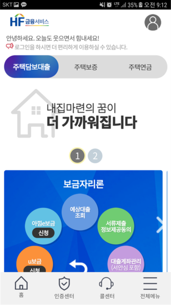 [스마트주택금융] 앱을 검색하여 설치한다. 설치 후에는 다음과 같은 화면을 볼 수 있는데, [아낌e보금] 신청 버튼을 누르면 된다. 이후에 공인 인증서 로그인 페이지가 나오는데, 공인인증서를 이용해 로그인하면 된다.