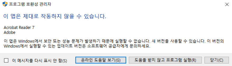 얼마 전부터 다음과 같은 오류가 주기적으로 컴퓨터 화면에 뜨게 되었다. "Adobe Acrobat/Reader에 문제가 있습니다. Adobe Acrobat/Reader를 종료하고 다시 시도하십시오." 오류 메시지가 한 번 뜨는 것이 아니라, 컴퓨터를 하고 있으면 몇십 분 주기로 반복적으로 뜨는 것이 화근이 되었다.