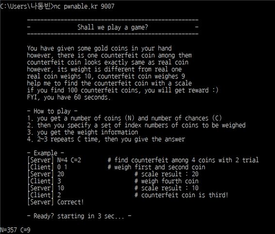 pwnable.kr의 coin1 문제를 풀기 위해 접속한 모습은 위와 같습니다. 어차피 nc 모듈도 서버와 소켓 통신을 이용해 메시지를 주고받는 프로그램에 불과하기 때문에 어떠한 프로그래밍 언어를 이용하던지 간에 똑같은 기능을 구현할 수 있습니다.