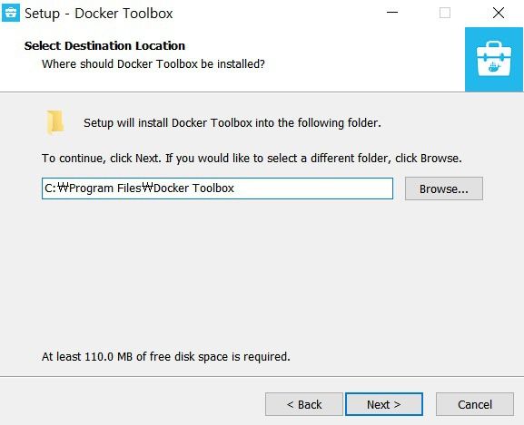 설치 경로를 물어보는데 기본 경로로 넣으시면 됩니다. 나중에 이 경로가 도커 기본 터미널의 경로로 설정됩니다.