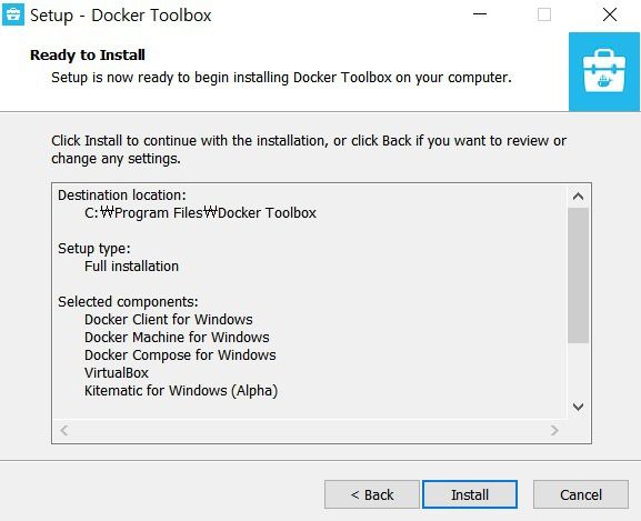 이제 설치 구성 목록을 물어보는데, 전체 설치(Full Installation)으로 설정해주세요. 보시면 도커 컴포즈(Docker Compose) 및 VirtualBox와 Kitematic이 설치되는 것을 알 수 있습니다. 전부 위에서 언급했던 것들이에요. 추가적으로 추후에 도커 이미지 생성을 위한 각종 파일들은 모두 깃(Git)을 이용해서 관리하는 것이 일반적이므로 혹여나 깃이 설치되어있지 않으신 분들은 설치해주시는 것을 강력히 추천합니다.