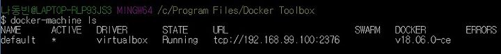 docker-machine ls: 현재 설치된 모든 도커 머신(Docker Machine) 정보를 출력합니다.