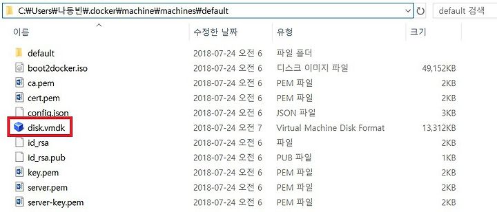 위와 같이 'default' 도커 머신의 경로를 찾아 들어가봅시다. 그랬더니 ISO 파일 및 vmdk 파일이 존재합니다. 다시 말해 Virtual Box에서 돌릴 수 있는 이미지가 그대로 존재하는 겁니다. vmdk 파일은 도커 머신 내부의 이미지 및 컨테이너를 모두 포함하고 있는 파일이기 때문에 만약에 특정 도커 머신에 이미지를 많이 설치하면 이 파일의 크기가 매우 커집니다. 이것저것 필요한 걸 모두 설치하다 보면 20GB도 우습게 될 수 있습니다. 도커는 가벼운 용량을 지향하지만 부득이한 경우를 잘 고려하셔야 합니다.