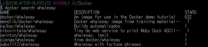 고래의 말(Whale Say)는 도커에서 튜토리얼 목적으로 만든 간단한 형태의 이미지입니다. 그냥 고래가 나와서 무슨 말을 하는 것 말고는 전혀 기능이 없습니다. (말 그대로 똥 같은 프로그램이죠...)